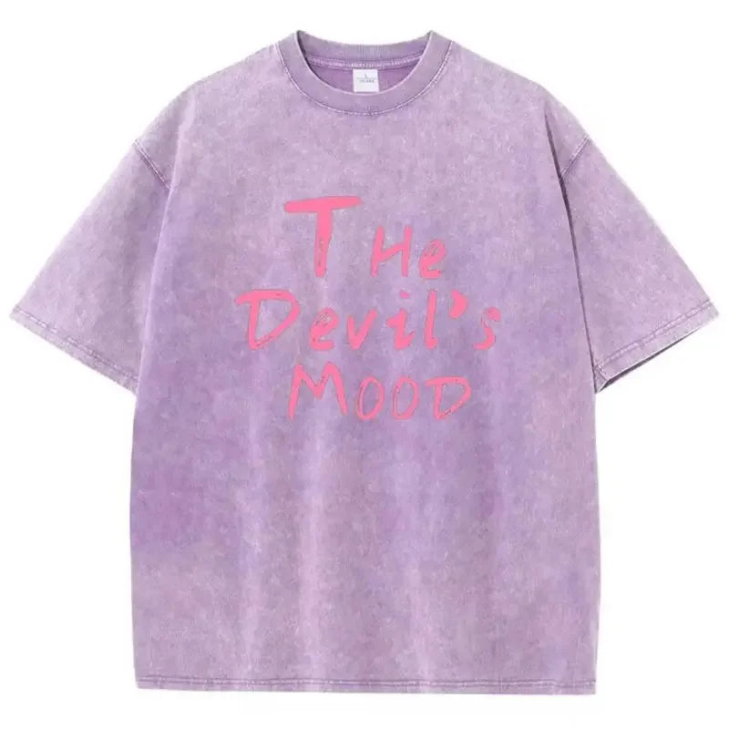 Fashion Womans Cotton Washed T-shirts The Devil's Moon Letter Prints Tops Casual O-Neck Oversize Tees Street Female Clothes