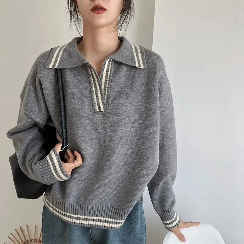Rimocy College Wind V Neck Knit Sweaters Women Korean Fashion Loose Long Sleeve Knitwear Woman Chic Turn Down Collar Jersey Tops