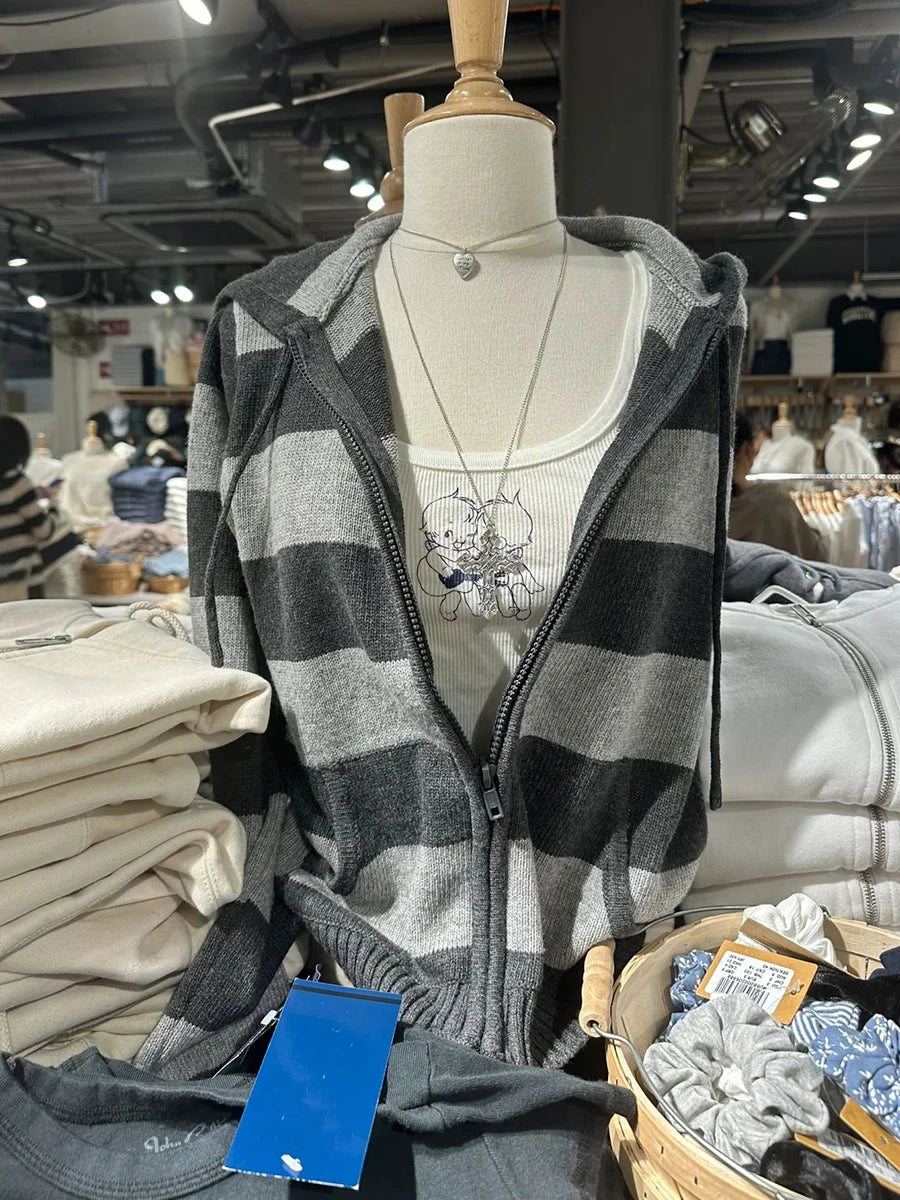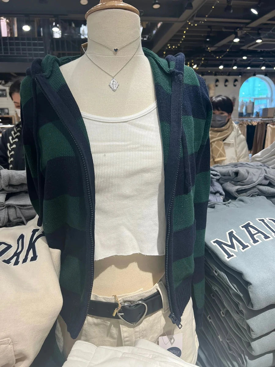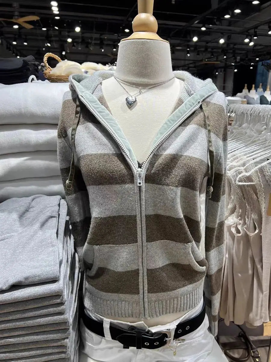 Striped Knitted Cropped Sweater Cardigan Women Autumn Long Sleeve Hooded Zipper Short Streetwear Knitwear Sweaters Y2K Crop Tops
