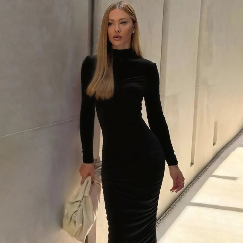 Women's New Solid Temperament Turtleneck Dress Fashion Bodycon Long Sleeve Slim Midi Dresses 2025 Sexy Skinny Party Evening Gown