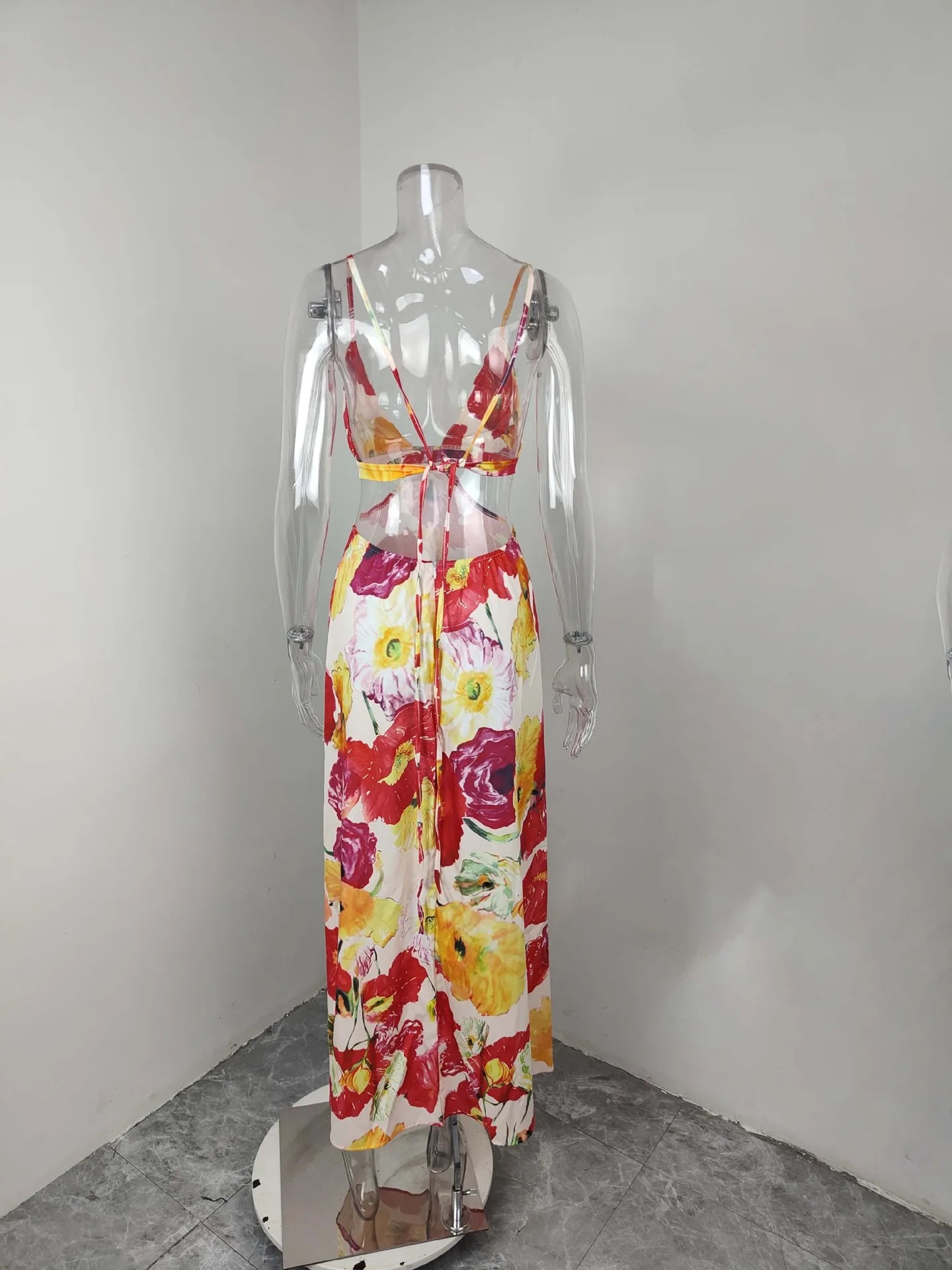 VEITCHE Summer Women Sexy V Neck Floral Print Maxi Dresses Elegant Sleeveless Backless Waist Hollow Out Vestidos Lady Club Party