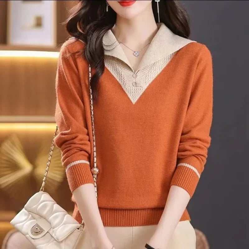 Women's Pullover V-neck Button Patchwork Sweaters 2023 Autumn and Winter New Loose Long Sleeve Fashion Elegant Knitted Tops